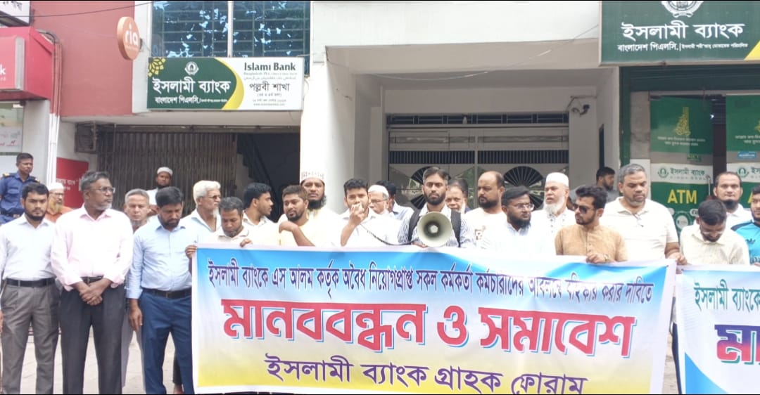 ব্যাংক খাতে এস আলম গ্রুপের কথিত ‘অবৈধ নিয়োগ ও দখলদারত্ব বাতিলের দাবিতে মিরপুরে ইসলামি ব্যংক গ্রাহক ফোরামের মানববন্ধন