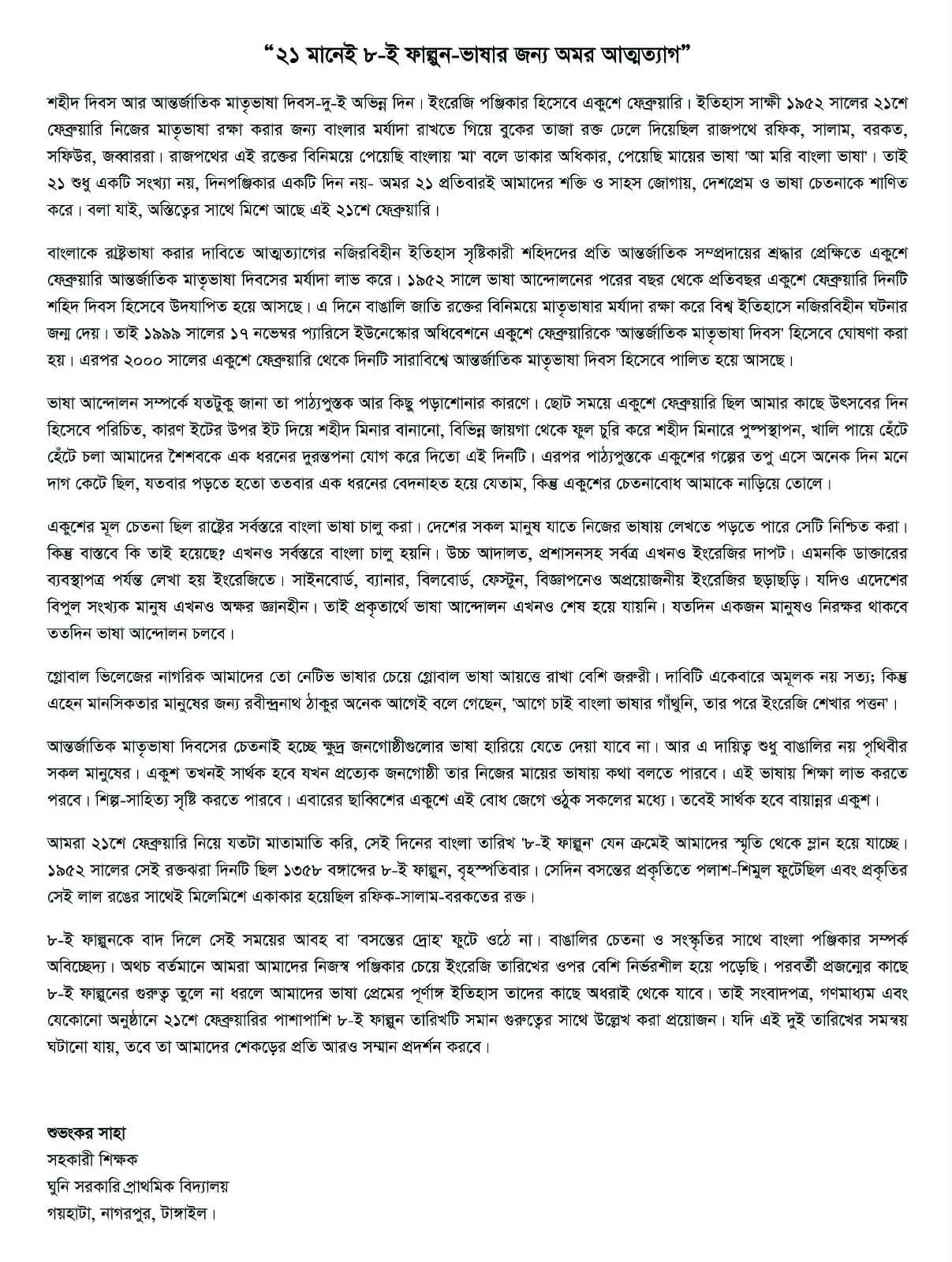 শহীদ দিবস আর আন্তর্জাতিক মাতৃভাষা দিবস—দুই-ই একই দিন। ইংরেজি পঞ্জিকা হিসেবে একুশে ফেব্রুয়ারি। ইতিহাস সাক্ষী ১৯৫২ সালের ২১শে ফেব্রুয়ারি নিজের মাতৃভাষা রক্ষা করার জন্য বাংলার মাটিতে বুকের তাজা রক্ত ঢেলে দিয়েছিলেন রাজপথে রফিক, সালাম, বরকত, শফিউর, জব্বাররা। রাজপথের এই রক্তের বিনিময়ে পেয়েছি বাংলাকে মা বলে ডাকবার অধিকার, পেয়েছি মায়ের ভাষা—আমার বাংলা ভাষা। তাই ২১ শুধু একটি সংখ্যা নয়, দিনপঞ্জিকার একটি দিন নয়—অমর ২১ প্রতিবছরই আমাদের শক্তি ও সাহস জোগায়, দেশপ্রেম ও ভাষা চেতনাকে শাণিত করে। বাঙালি জাতির আত্মত্যাগের সাথে মিশে আছে এই ২১শে ফেব্রুয়ারি।
