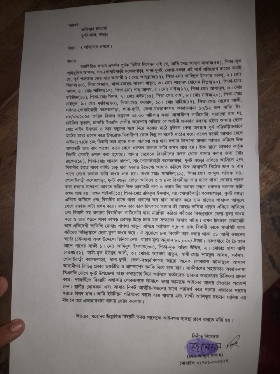 নাইমের মা জানান, দীর্ঘদিন ধরে আমার ছেলে নাইমকে একই এলাকার জাহিদুল ইসলাম বাবলুর ছেলে আব্দুল্লাহ নাগরিক ঐক্য নামে একটি রাজনৈতিক দলের বিভিন্ন মিছিল মিটিংয়ে যেতে চাপ দিয়ে আসছিলো। তার প্রস্তাবে রাজি না হওয়ায় সোমবার বিকেলে আমার ছেলে ফুটবল খেলার জন্য মাঠে যাওয়া মাত্র ওরা পরিকল্পিতভাবে মাঠের মধ্যে প্রবেশ করে আব্দুল্লাহর হাতে থাকা ধারালো অস্ত্র দ্বারা হত্যার উদ্দেশ্যে মাথায় আঘাত করে। আঘাতটি লক্ষভ্রষ্ট হয়ে আমার ছেলের বাম পাশের কানে লেগে গুরুতর রক্তাক্ত কাটা জখম প্রাপ্ত হয়। পরে ডাক্তার কর্তৃক তিনটি সেলাই দেওয়া হয়েছে। এঘটনায় থানায় লিখিত অভিযোগ করেছি।