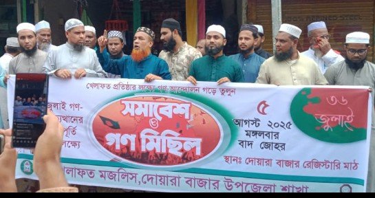 দোয়ারাবাজার (সুনামগঞ্জ): সুনামগঞ্জের দোয়ারাবাজার উপজেলায় খেলাফত মজলিসের উদ্যোগে প্রশিক্ষণমূলক তরবিয়তী মজলিস ও গণমিছিল অনুষ্ঠিত হয়েছে। মঙ্গলবার (৫ আগস্ট) উপজেলার মা কমিউনিটি সেন্টারে এ অনুষ্ঠান অনুষ্ঠিত হয়।