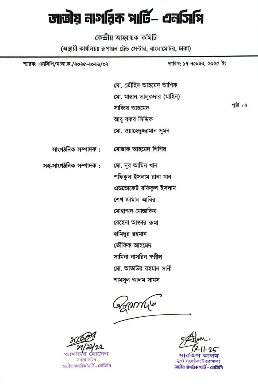 জাতীয় নাগরিক পার্টি (এনসিপি) এর ঢাকা মহানগর উত্তর আহ্বায়ক কমিটি ১৭ নভেম্বর ২০২৫, সোমবার সকালে রাজধানীর দলীয় কার্যালয়ে আগামী ছয় মাসের জন্য আনুষ্ঠানিকভাবে ঘোষণা করা হয়েছে। নবগঠিত এই কমিটিতে টাঙ্গাইলের নাগরপুরের কৃতি সন্তান মোঃ ওয়াহেদুজ্জামান সুমন যুগ্ম সদস্য সচিব পদে মনোনীত হয়েছেন।