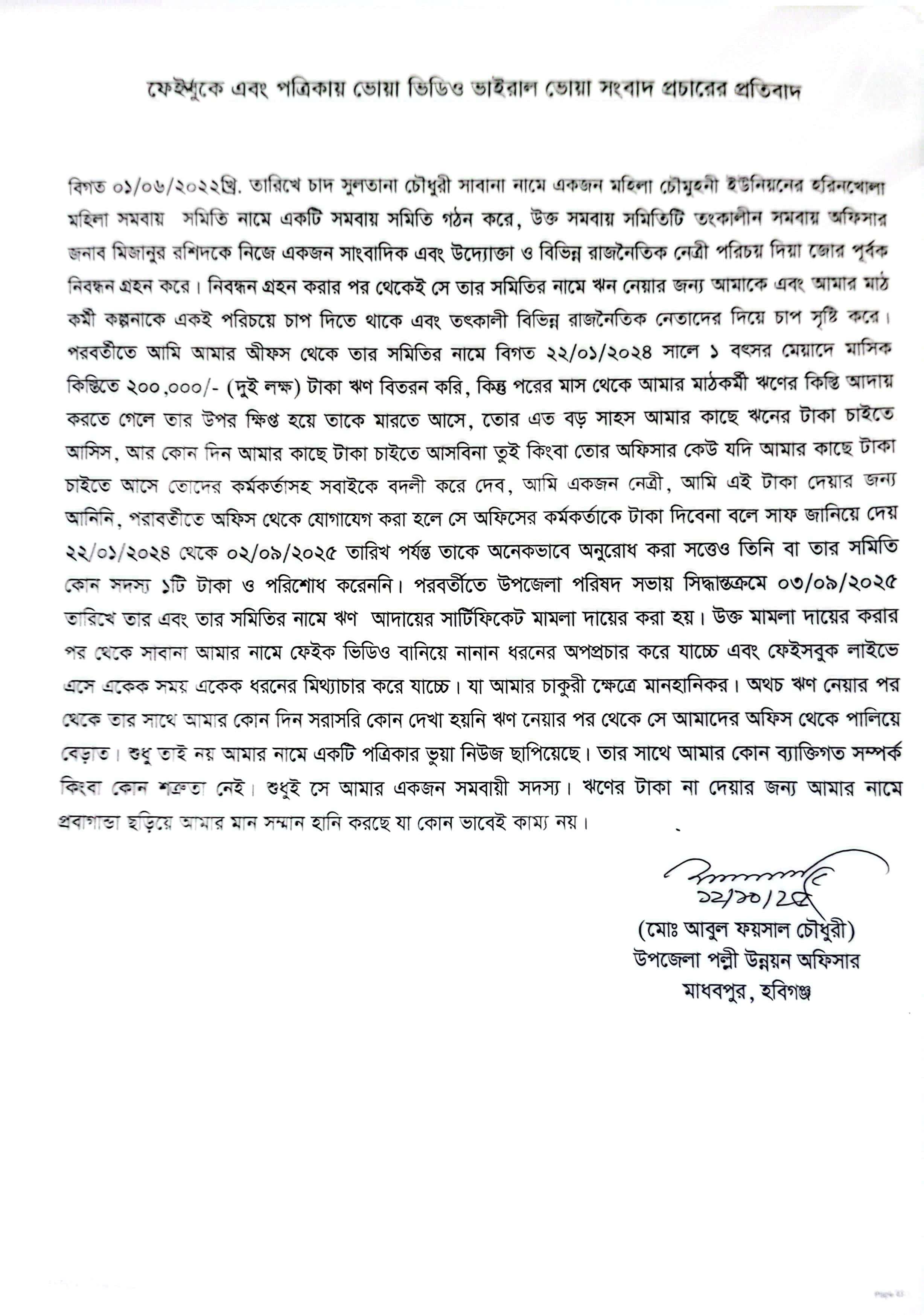 হবিগঞ্জের মাধবপুর উপজেলা পল্লী উন্নয়ন কর্মকর্তা মো. আব্দুল ফয়সল চৌধুরীর নামে ফেসবুকসহ বিভিন্ন গণমাধ্যমে প্রকাশিত সংবাদ ও ভিডিওকে মিথ্যা, ভিত্তিহীন ও উদ্দেশ্য প্রণোদিত বলে দাবি করেছেন।