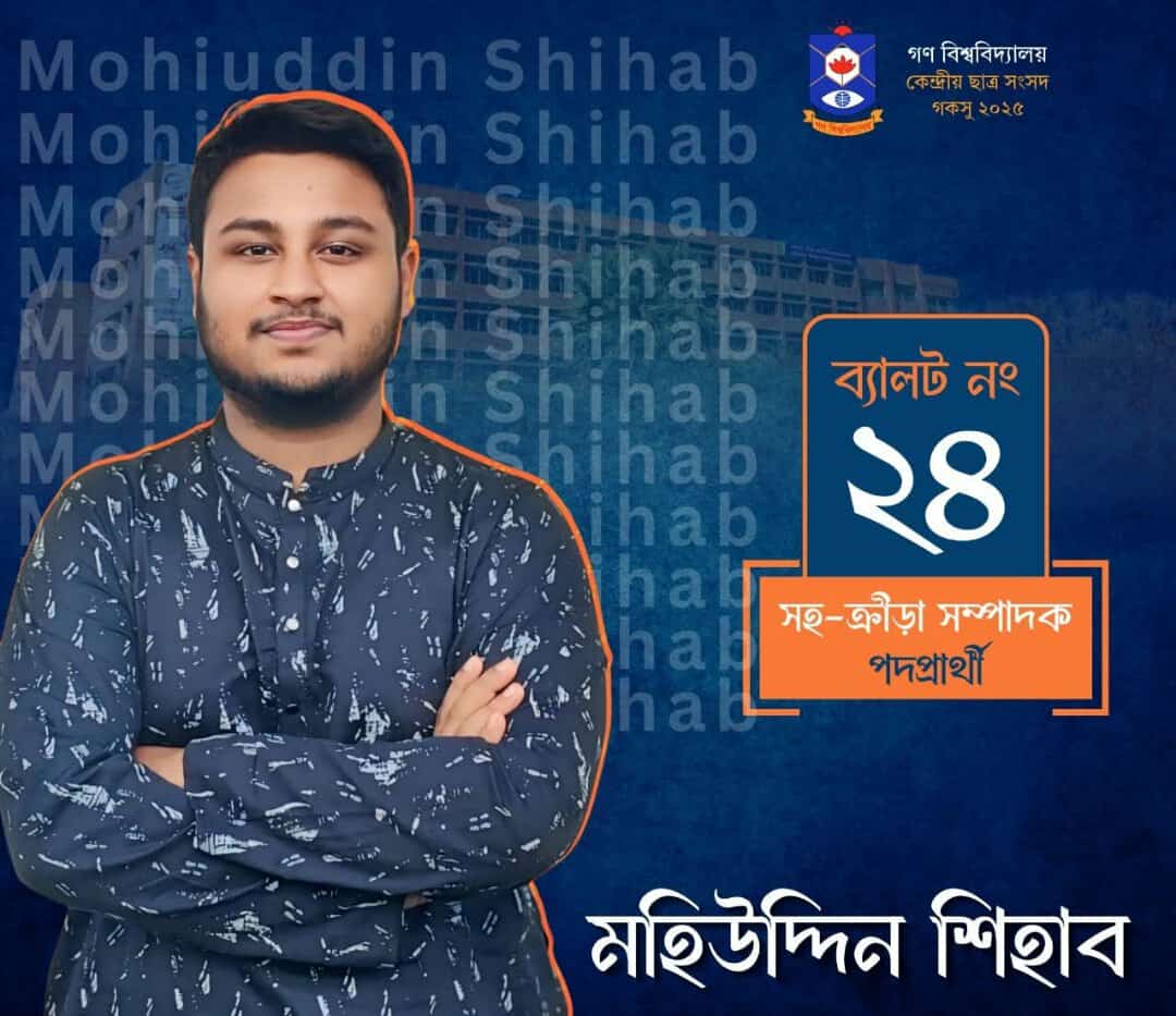 গণ বিশ্ববিদ্যালয় কেন্দ্রীয় ছাত্র সংসদ (গকসু) নির্বাচনে সহ- ক্রীড়া সম্পাদক পদে প্রতিদ্বন্দ্বিতা করছেন টাঙ্গাইল জেলার নাগরপুর উপজেলার দুয়াজানী কলেজ পাড়া গ্রামের মেধাবী শিক্ষার্থী মহিউদ্দিন শিহাব। তিনি বিশ্ববিদ্যালয়ের আইন বিভাগের ৩১তম ব্যাচের তৃতীয় সেমিস্টারের শিক্ষার্থী। তার ব্যালট নম্বর ২৪।