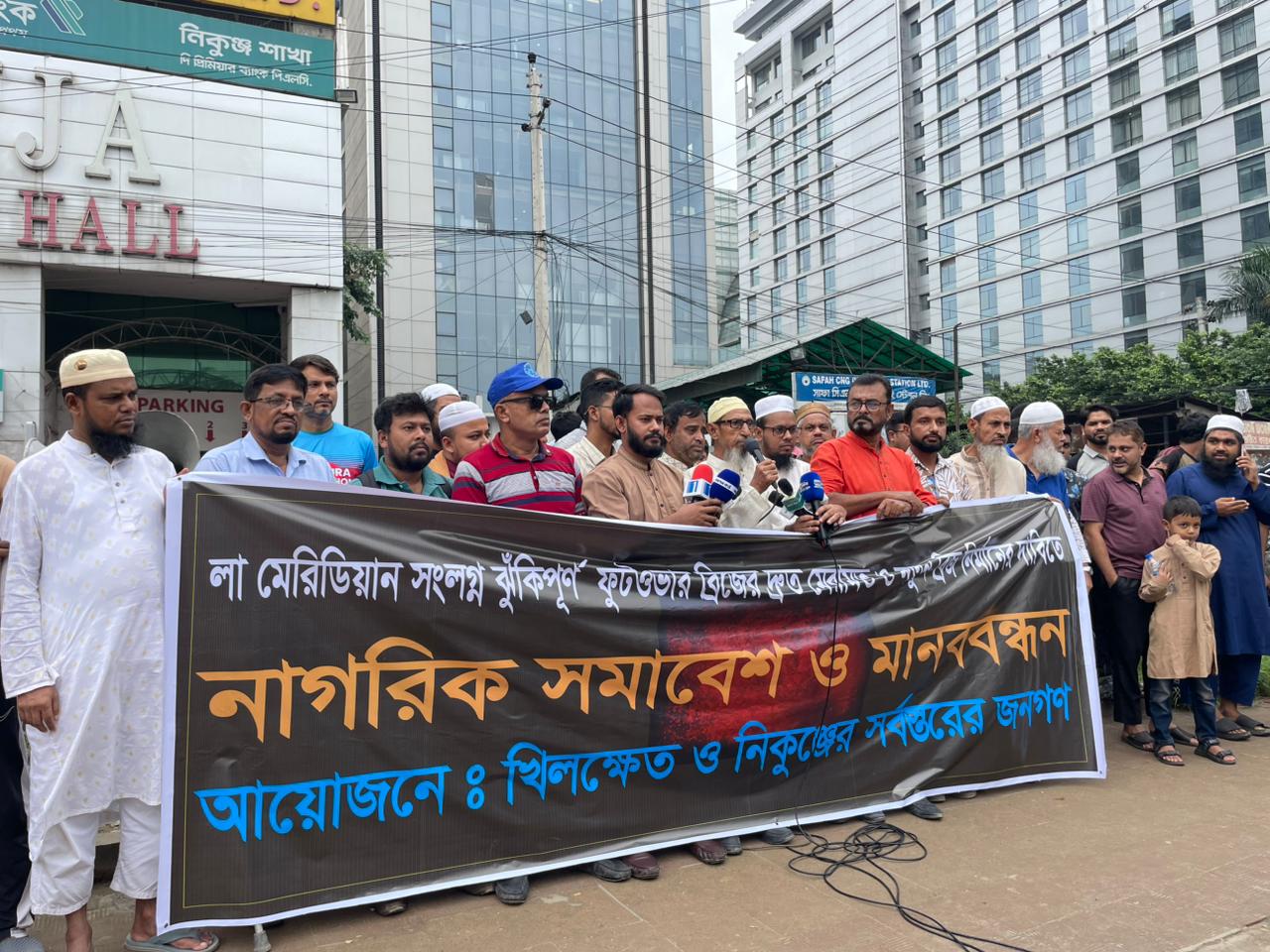 সমাবেশে বক্তারা আরও বলেন, “ঝুঁকিপূর্ণ লা মেরিডিয়ান ফুটওভার ব্রিজের পাশাপাশি খিলক্ষেত বাসস্ট্যান্ডের ফুটওভার ব্রিজটিও এখন ভগ্নদশায়। দুটি ব্রিজই দ্রুত সংস্কার এবং ভবিষ্যতের জন্য আধুনিক সুবিধাসম্পন্ন নতুন ব্রিজ নির্মাণের স্থায়ী ব্যবস্থা করতে হবে।”
