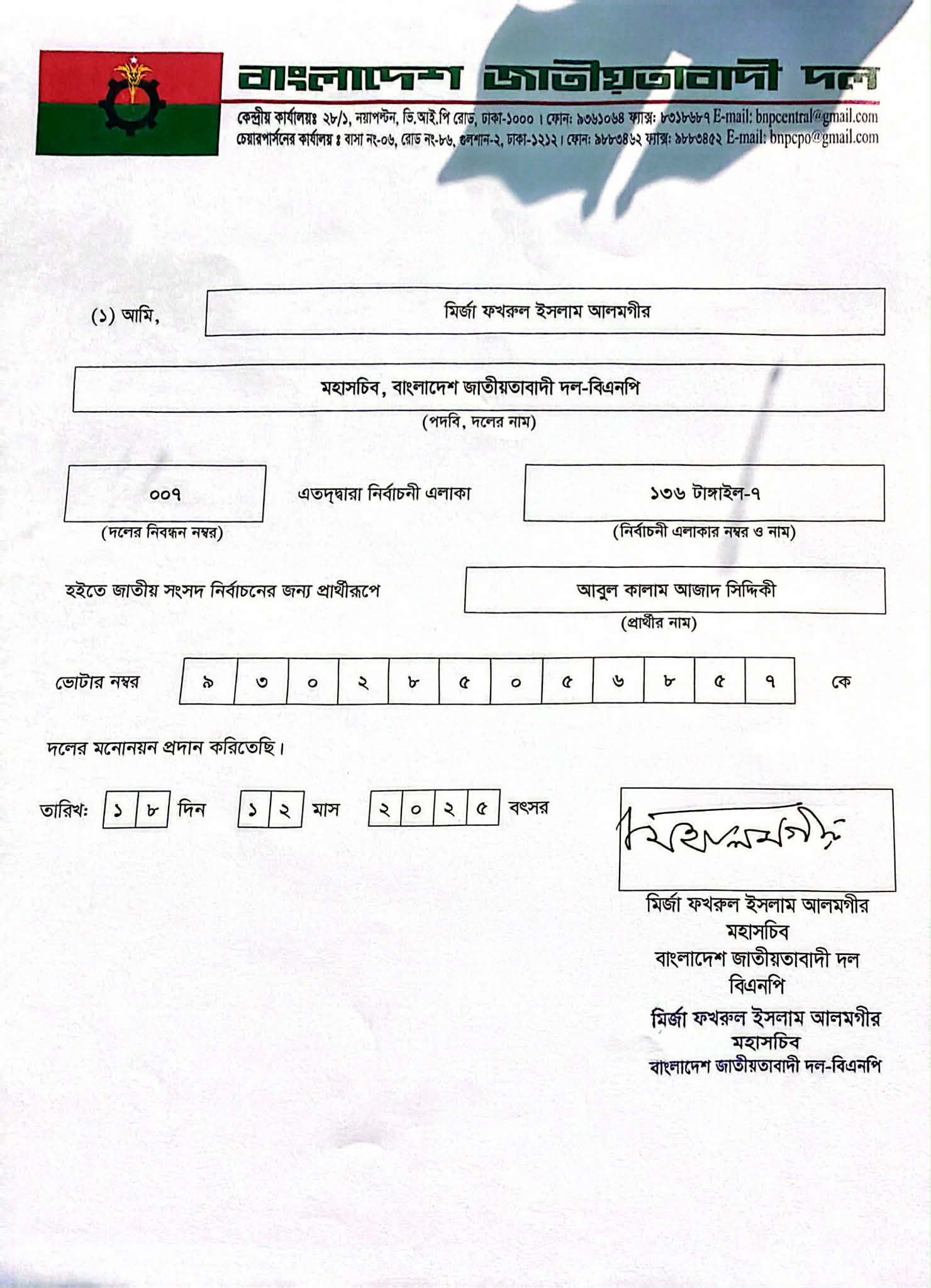 বুধবার বিএনপির মহাসচিব মির্জা ফখরুল ইসলাম আলমগীর স্বাক্ষরিত চুড়ান্ত মনোনয়নের একটি চিঠি আবুল কালাম আজাদ সিদ্দিকীর নামে ইস্যু করা হয়।