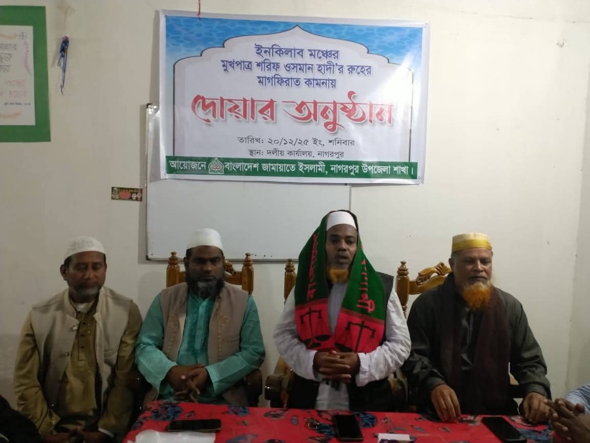 ইনকিলাব মঞ্চের মুখপাত্র শহীদ শরিফ ওসমান হাদীর স্মরণে বাংলাদেশ জামায়াতে ইসলামী নাগরপুর উপজেলা শাখার উদ্যোগে আলোচনা সভা ও দোয়া মাহফিল অনুষ্ঠিত হয়েছে। শনিবার (২০ ডিসেম্বর) বাদ মাগরিব উপজেলা জামায়াতে ইসলামীর কার্যালয়ে এ কর্মসূচি পালিত হয়।