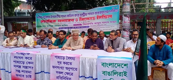পার্বত্যচট্টগ্রামে রাষ্ট্রীয় সার্বভৌমত্ব রক্ষায় উপজাতীয় শাসনব্যবস্থা বাতিল করে সংবিধানসম্মত এককপ্রশাসনিক কাঠামো প্রতিষ্ঠার দাবিতে শুক্রবার (১০ অক্টোবর) বিকাল৩.০০ ঘটিকায় রাজধানীর জাতীয় প্রেসক্লাবের সামনে আয়োজিত এক নাগরিক সমাবেশে এই দাবি জানানো হয়।