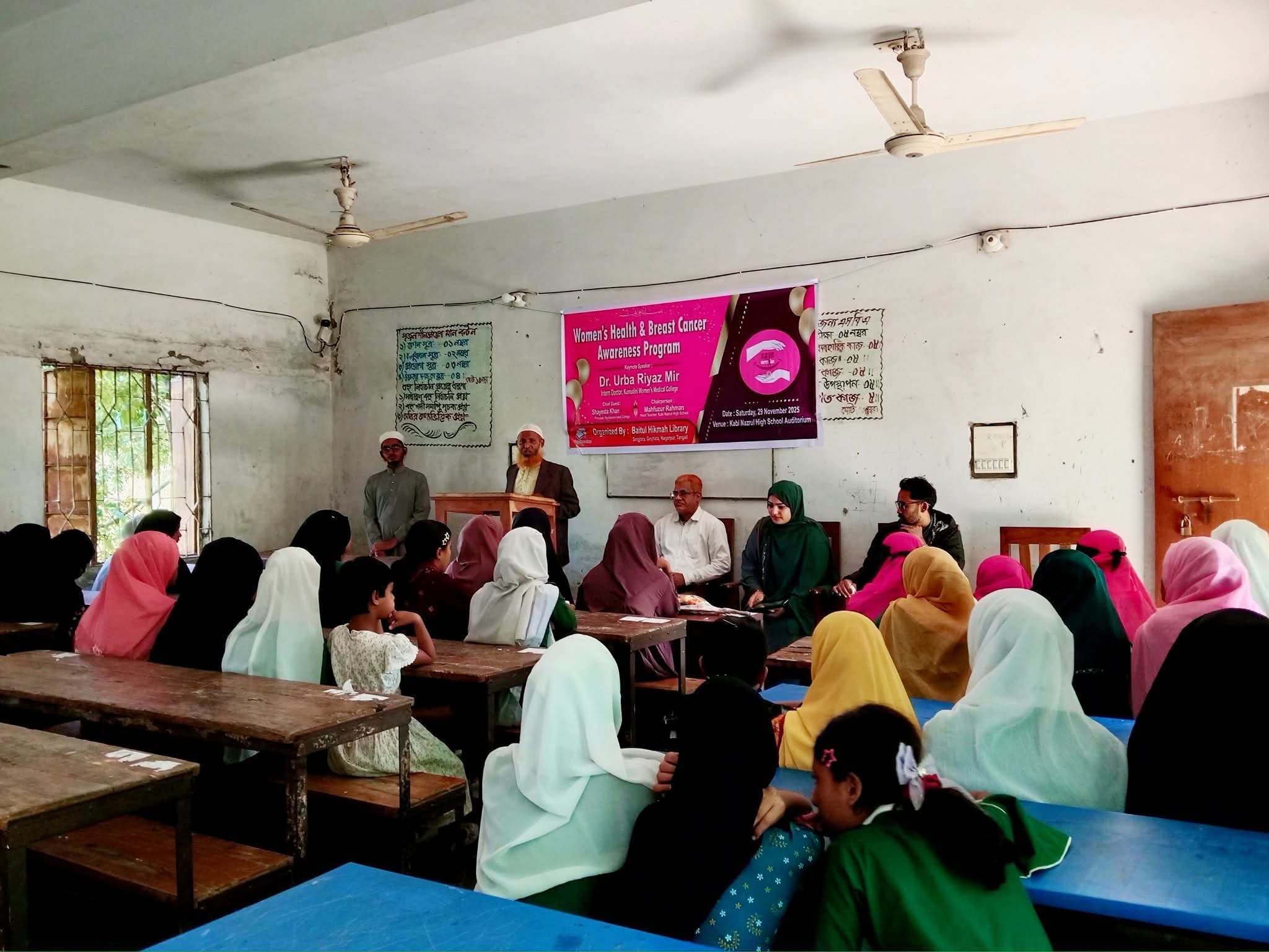 টাঙ্গাইলের নাগরপুরে শনিবার (২৯ নভেম্বর ২০২৫) সকালে কবি নজরুল উচ্চ বিদ্যালয়ের হলরুমে গয়হাটা ইউনিয়নের সিংজোড়া গ্রামে অবস্থিত ঐতিহ্যবাহী বাইতুল হিকমাহ পাঠাগার–এর উদ্যোগে নারীদের স্বাস্থ্য সচেতনতা ও স্তন ক্যান্সার প্রতিরোধ বিষয়ক গুরুত্বপূর্ণ একটি সচেতনতামূলক অনুষ্ঠান অনুষ্ঠিত হয়। এতে স্কুল ও কলেজের অসংখ্য ছাত্রী অংশগ্রহণ করেন।