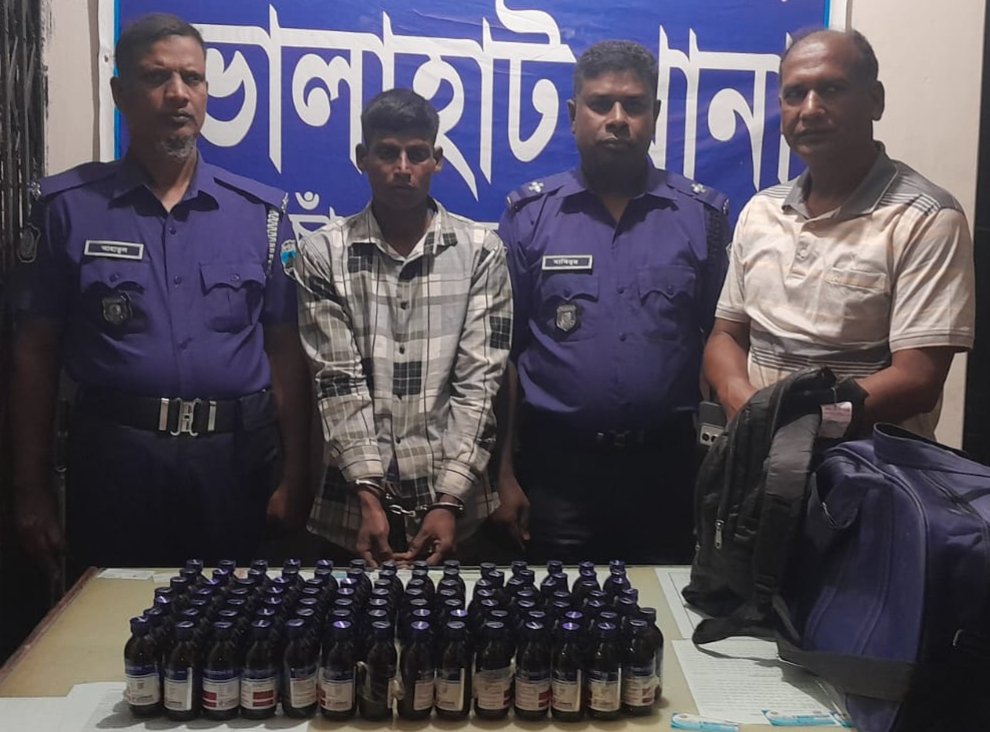 ছবি: ভোলাহাটে থানা পুলিশের বিশেষ অভিযানে ৯৮ বোতল ভারতীয় নিষিদ্ধ ইসকাপ সিরাপসহ ১ জন আটকের ছবি।