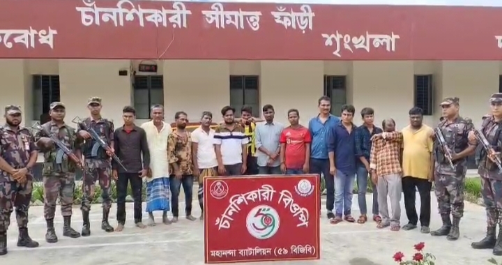 ছবি: ছবিক্যাপশন: ভোলাহাট চাঁনশিকারী কোম্পানীর চামুশা সীমান্ত দিয়ে ফের ১৩ জনকে পুশব্যাক করেছে ভারতীয় বিএসএফ। আটককৃতরা এবং বিজিবি সদস্যদের দৃশ্য।