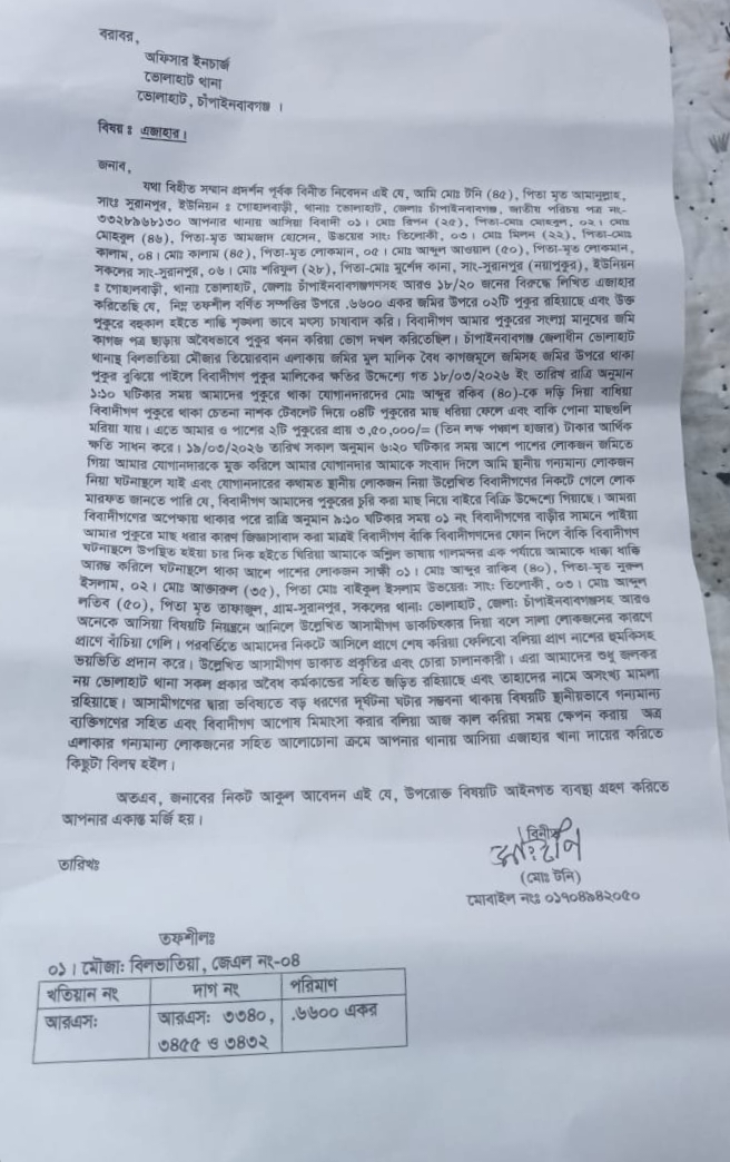 চাঁপাইনবাবগঞ্জের ভোলাহাটে সরকারী জলাশয় বৈধভাবে লিজ নিয়ে দুষ্কৃতিকারীদের চক্রান্তে লাখ লাখ টাকার দেশী প্রজাতির মাছ পুকুরে চেতনা নাষক মিশিয়ে মেরে ফেলার অভিযোগ, প্রেক্ষিতে থানায় মামলায় অভিযোগ পাওয়া গেছে!!