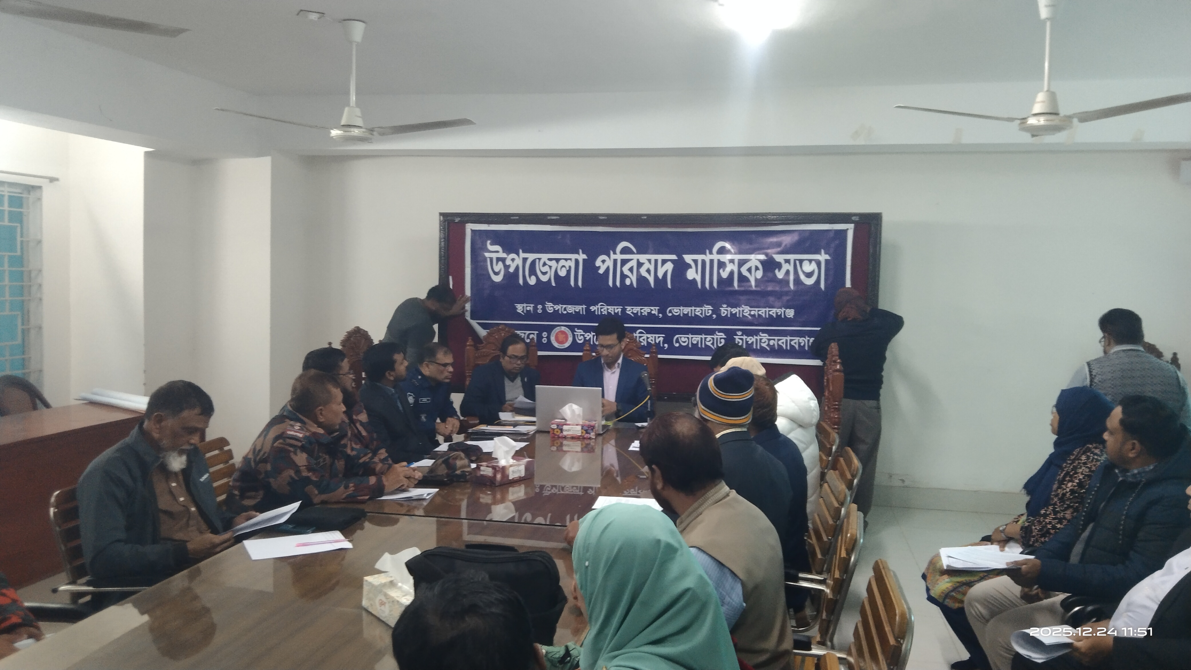 চাঁপাইনবাবগঞ্জের ভোলাহাটে উপজেলা প্রশাসনের আয়োজনে মাসিক আইন-শৃঙ্খলা, সমন্বয় কমিটি উপজেলা নির্বাহী অফিসার মো শাহীন মাহমুদের সার্বিক তত্বাবধানে ও সভাপতিত্বে উপস্থিত ছিলেন, উপজেলা সহকারী কমিশনার (ভূমি) মোঃ শামীম হোসেন। বুধবার সকাল ১০টায় (২৪ ডিসেম্বর ২০২৫) উপজেলা মডেল মসজিদ মিলনায়তনে বিভিন্ন অনুষ্ঠানমালা অনুষ্ঠিত হয়।