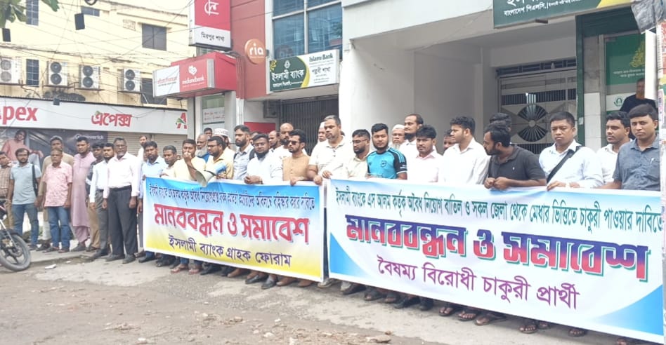 ব্যাংকিং খাতে এস আলম গ্রুপের কথিত ‘অবৈধ নিয়োগ ও একচেটিয়া দখলদারত্ব’ বাতিলের দাবিতে ইসলামী ব্যংক গ্রাহক ফোরামের মানববন্ধন অনুষ্ঠিত হয়েছে। সোমবার (৬ই অক্টোবর) রাজধানীর মিরপুরে ইসলামি ব্যংক পল্লবী শাখার সামনে মানববন্ধন করেছে ইসলামী ব্যাংকের গ্রাহক ফোরামের নেতৃবৃন্দ ও সেবাগ্রহীতারা ।