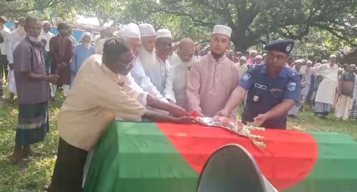 ছবি: ছবিক্যাপশনঃ ভোলাহাটে মুক্তিযোদ্ধা মদিন মাঝির নামাজে জানাযায় ফুলের তোড়া দিয়ে বরণের দৃশ্য। পাশে-উপজেলা নির্বাহী অফিসারের প্রতিনিধি ও থানা অফিসার ইনচার্জ মোঃ শহিদুল ইসলাম