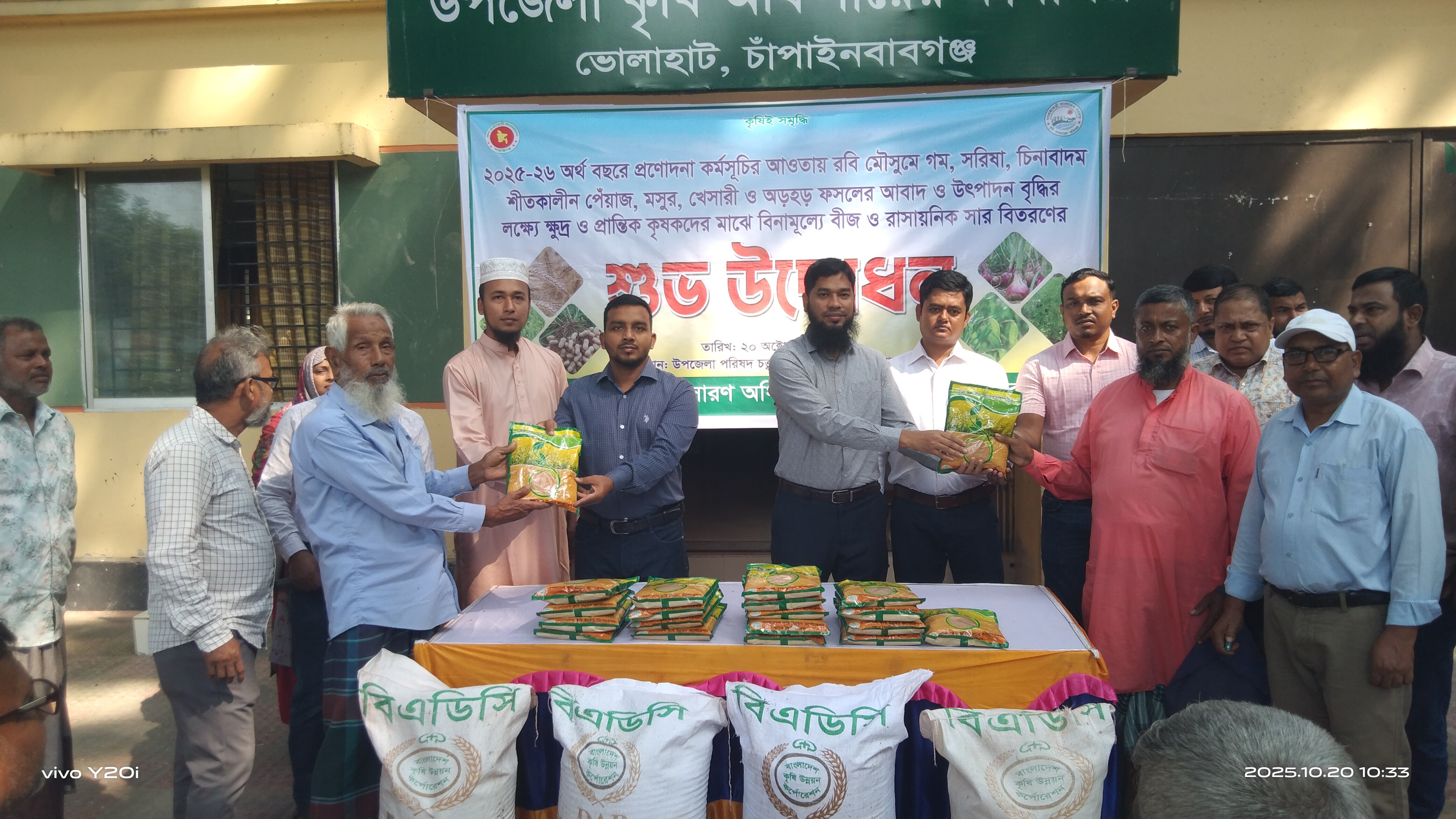 চাঁপাইনবাবগঞ্জের ভোলাহাটে উপজেলা কৃষি দপ্তরের আয়োজনে রবি মৌসুমে শীতকালীন ক্ষুদ্র ও প্রান্তিক কৃষকদের মাঝে বিনামূল্যে বীজ ও রাসায়নিক সার বিতরণ অনুষ্ঠান সোমবার সকাল ১০টায় (২০ অক্টোবর ২০২৫) উপজেলা কৃষি দপ্তর প্রাঙ্গণে অনুষ্ঠিত হয়।
