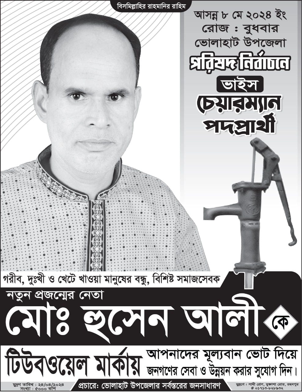 এলক্ষ্যে ভোলাহাট উপজেলা পরিষদ নির্বাচনে ভাইস চেয়ারম্যান পদপ্রার্থী, সমাজ সেবক, জনদরদী টিউবওয়েল প্রতীক নিয়ে সম্পূর্ণ নতুনমুখ এ নির্বাচনের মাঠে নেমেছেন মোঃ হুসেন আলী।
